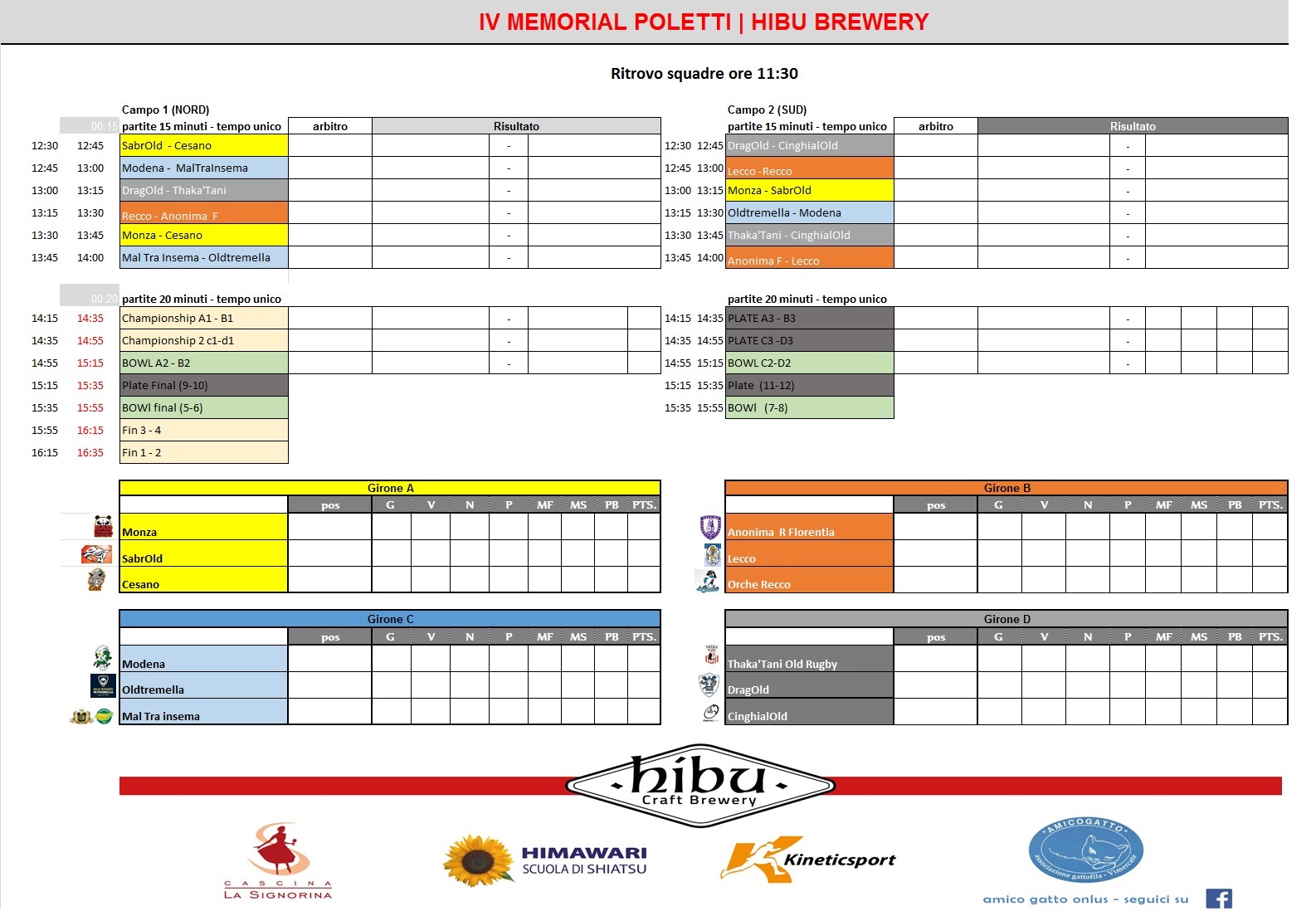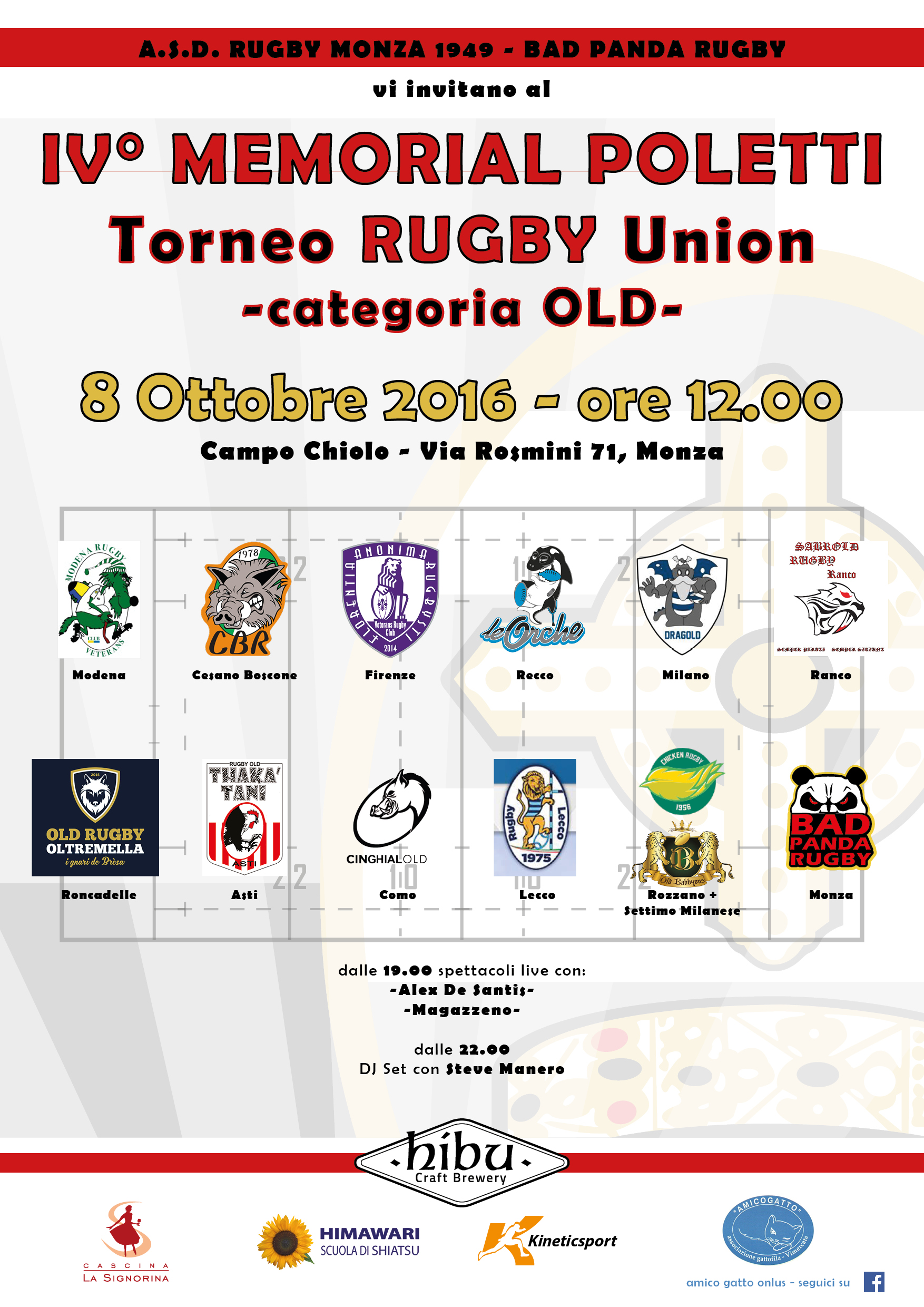 IV° Memorial Poletti Torneo Rugby Union – Old 2 ottobre 20162 ottobre 2016 Sabato 8 Ottobre i Sabrold parteciperanno al IV° Memorial Poletti Torneo Rugby Union, categoria Old. Il torneo avrà luogo al Campo Chiolo – Via Rosmini 71, Monza. Per saperne di più consultate la locandina e gli orari delle partite allegate. Condividi: Fai clic per condividere su X (Si apre in una nuova finestra) X Fai clic per condividere su Facebook (Si apre in una nuova finestra) Facebook Mi piace Caricamento... Correlati