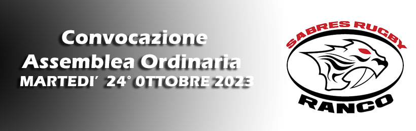 In ottemperanza allo Statuto , è convocata per Martedì 24 ottobre 2023, presso il Clubhouse Sabres Rugby, in via Quassa, snc, Ranco (VA) alle ore 19:00 in prima convocazione e alle ore 20:00 in seconda convocazione un’Assemblea Ordinaria dell’Associazione Sportiva Dilettantistica Sabres Rugby Club.